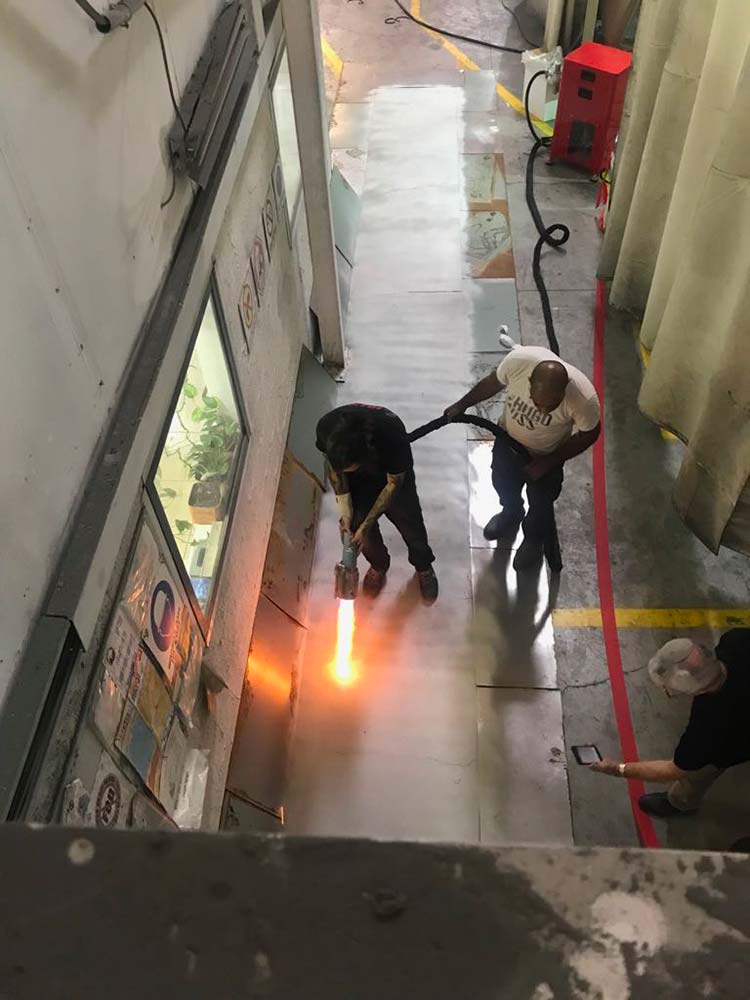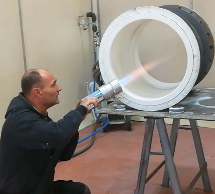 Revolutionäres tragbares System für die Flammspritzbeschichtung von Untergründen aus Metall, Auffangwannen, Behältern, Stahlstrukturen, Betonböden und anderen Oberflächen.